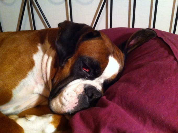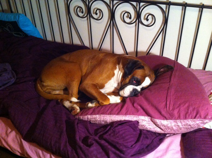 Jag har nu krupit ner i sängen bredvid sötnosen på bilden och ska snart sova. Resten av familjen kollar på en film som verkade bra men jag är alldeles för trött för det. Pensionärs-varning på mig? Äsch, skönt att sova ju! Önskar dock att Simon var här, sover sjukt mycket bättre tillsammans med honom. Men vovven är mysig hon med!