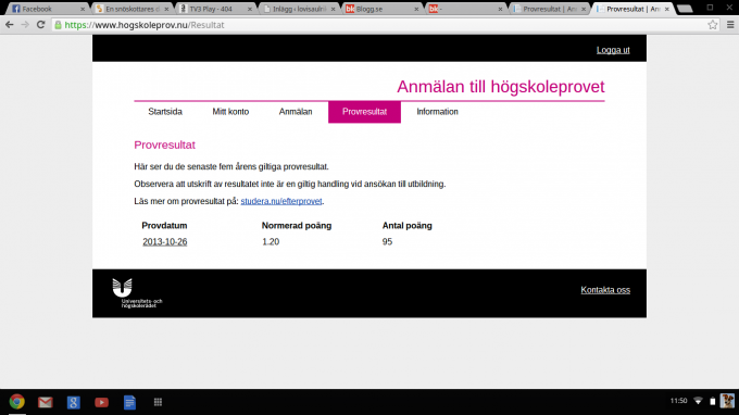 Jag har nu sett mitt resultat från högskoleprovet och JAG ÄR NÖJD! Hade som sagt inga förväntningar alls för att jag inte skulle bli besviken så även fast jag räknat ut min poäng innan vågade jag inte hoppas allt för mycket. Men nu kan jag se det riktiga resultat och jag fick 1.2! Med tanke på att jag går fordonsprogrammet och därför bara har läst matte 1a (håller på med matte 2a) så är jag sjukt stolt! Detta bevisar hur fel alla har som tror att man är korkad bara för att man går fordon! 😀