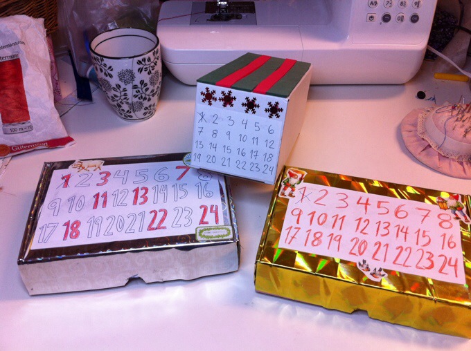 När jag kom hem satte jag mig och pysslade ihop tre chokladkalendrar, en varsin till mig och mina systrar. Överambitiöst? 😉 Trots att jag har haft en julkalender varje år så tycker jag att chokladen i dom är ganska äcklig haha. Så nu har jag istället köpt goda chokladbitar och lagt i lådor som jag pyntat. I min är det bara mörk choklad! 😀 Godare, nyttigare och lite mer personligt.