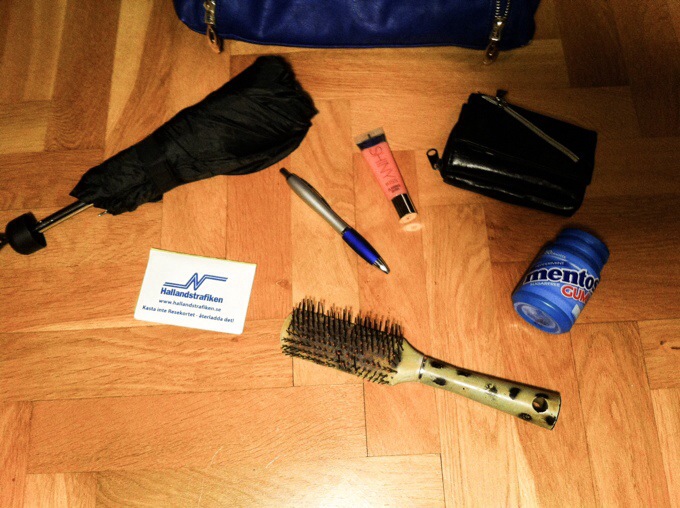 Här nedan är en bild på saker som jag i 9 fall av 10 har i min handväska och har jag glömt någon av sakerna så brukar jag sakna det. Ett paraply för att jag sällan har regnjacka på mig. Plånbok är väl ganska självklart haha?  Busskortsficka som jag oftast trycker ner massa kort och pengar i för att ha som en smidig plånbok.  Läppglans därför att jag hatar torra läppar, det är fint och smakar gott. Tuggummi -gott och fräsch andedräkt. Penna därför att det alltid är bra att ha. Hårborste för att mitt hår alltid tjorvar sig.
