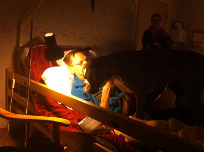 Inatt har det snöat massor och det fortsatte under dagen vilket gör att man på landet blir lite insnöad. Så jag och Helena tog varsin skyffel och skottade några meter uppe vid infarten till gården för att vi överhuvudtaget skulle ta oss ut med bilen. När det var klart åkte vi till Järpen för att Hälsa på Ingemar igen och denna gången fick Tindra följa med då vi fått reda på att hundar är tillåtna. Ingemar älskar hundar och saknar ju sin egna hund så att få träffa Tindra gjorde honom riktigt lycklig. Och vi blev glada över att se att han var mycket piggare idag jämfört med i måndags. 😀 Ända sedan vi kom till Jämtland har Tindra gått runt på gården och letat efter Ingemar så hon var också glad.