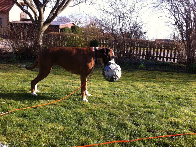 När jag kom hem möttes jag av en glad vovve i trädgården som ville spela fotboll och jag ställde självklart upp! 😀 Efter snart 7 år så är jag fortfarande fascinerad över hur hon lyckad bita i den stora bollen med sin lilla mun haha, hon är dessutom ganska duktig på att nicka bollar med nosen.
