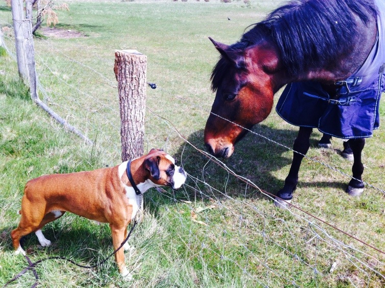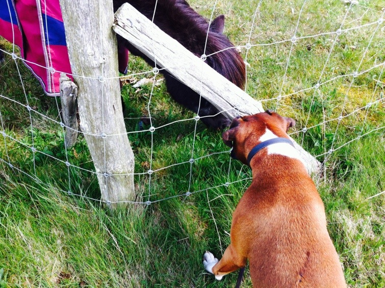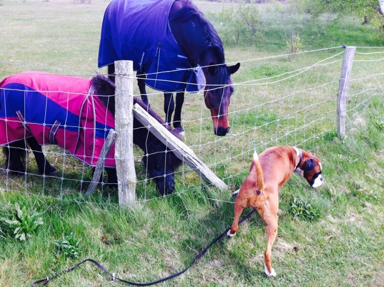 Jag stod och matade hästarna med gräs och då ville Tindra skydda mig från ”de farliga” hästarna så hon morrade och skällde. Några gånger försökte hon sig till och med på en riktig attack genom att hoppa rakt in i stängslet haha, jag misstänker att den hunden inte har jättehögt IQ… Men hennes utbrott kom lite då och då och däremellan var hon bara nyfiken på hästarna haha.