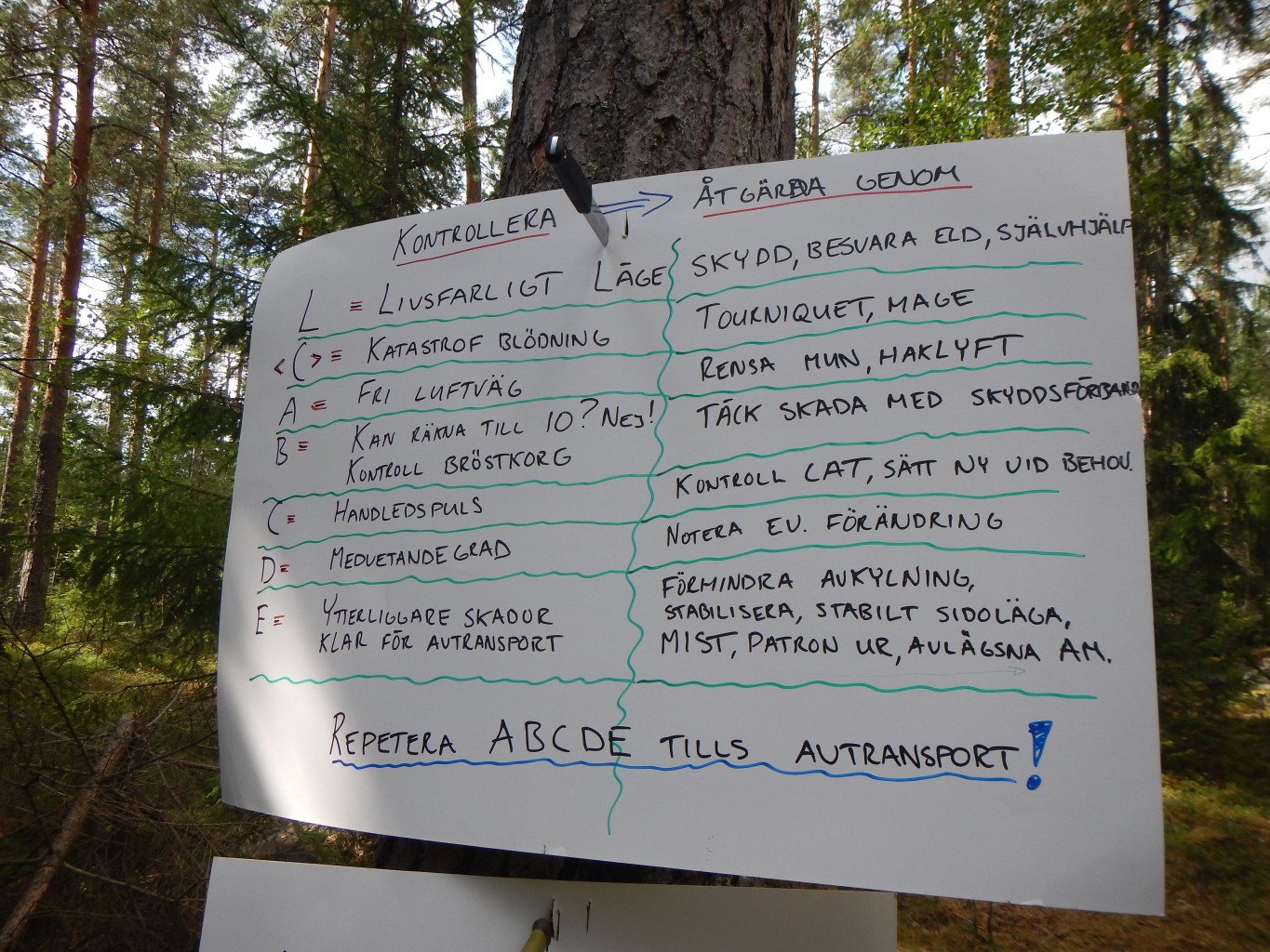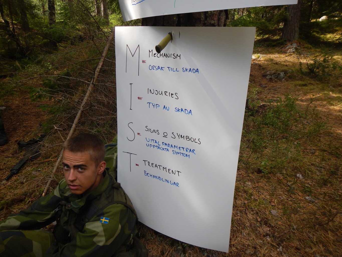Tisdagens moment var alla inriktade på sjukvård och dagen bestod av olika stationer. Vi började på stationen där man skulle genomföra alla 3 faserna i TOS (taktiskt omhändertagande av stridsskadad). Då börjar man bl.a med att skjuta tillbaka mot den som skadat kamraten, sedan sätta ett avsnörande förband (tourinquet) och lägga personen på mage.  Sedan så släpar man den skadade till en tryggare plats för att gå igenom ABCDE. När det är klart ska man sen transportera den skadade till en ännu bättre plats men då behöver man inte längre ha låga ställningar så man slipper släpa personen. Till min glädje blev jag godkänd på denna delen på 1:a försöket trots att det var mycket att tänka på.! 😀