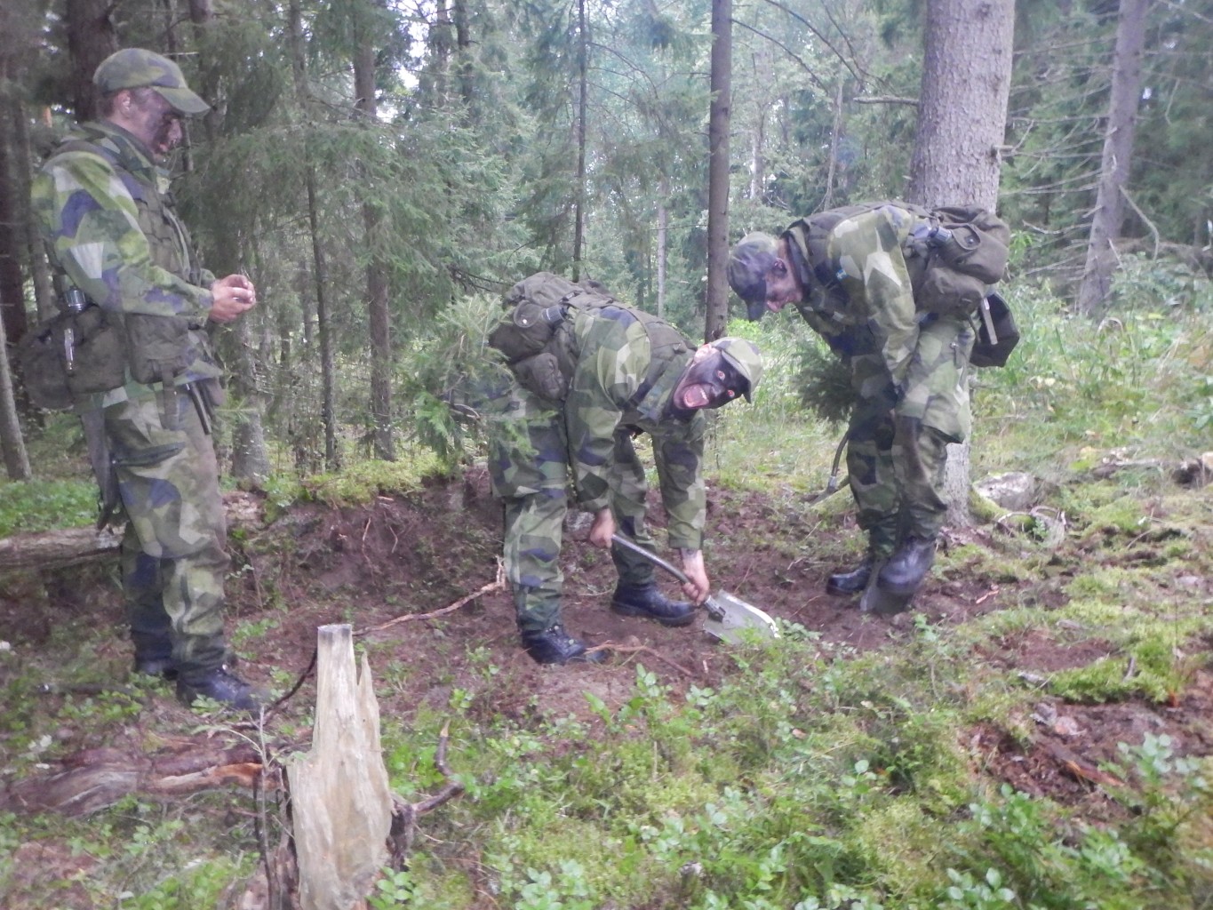 efter skjutningen gick vi in i skogen till stället där vi skulle ha vår förläggning denna gång. Det 1:a vi fick göra var att fixa eldställningar genom att gräva liggvärn. Jag hade en hel del huvudvärk från förkylningen så det var mindre kul haha, men efter lite hjälp från 2 andra så blev mitt och Nybergs värn till slut klart. Nu hade det börjat bli mörkt så när vi skulle upp med tälten tog det lite längre tid, dessutom var det många som var trötta och på dåligt humör. Min grupp lyckades lägga tältet upponer och upptäckte det inte förrän det var halvvägs uppe haha, själv mådde jag dåligt så jag hade fixat med lite annat under tiden. Men efter lite om och men var tältet uppe, en hygienplats byggd och två pissgropar grävda och vi kunde gå och lägga oss. förutom ett eldpass mellan 1 och 2 så sov jag gott hela natten.