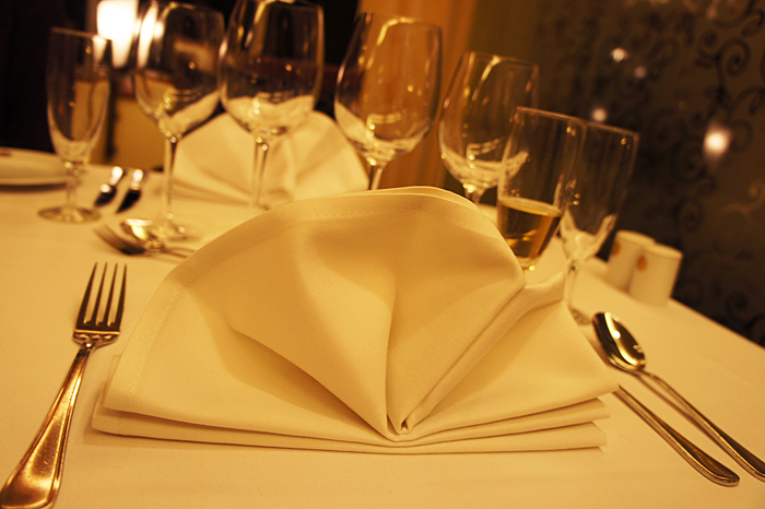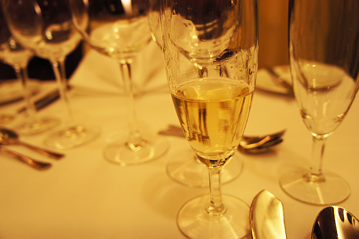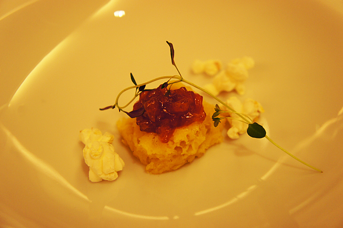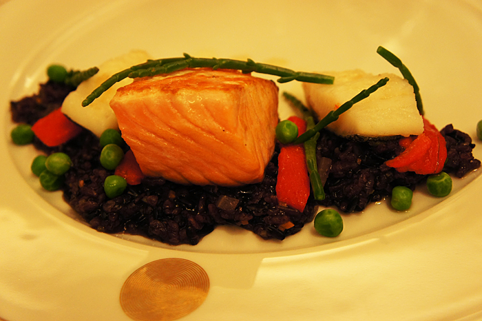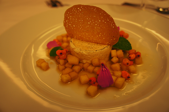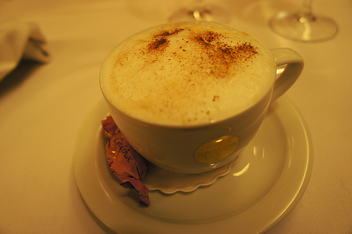 Lyxig middag i gourmetrestaurangen på färjan i går. Flera glas champagne, majssoppa med popcorn(!) (bilden visar innan soppan hällts upp i tallriken), en smarrig fiskrätt och en ljuvligt god efterrätt som liknade crème brûlée med havtorn och äpplen. Det hela avrundades med en cappuccino innan det var dags att gå och lägga sig.