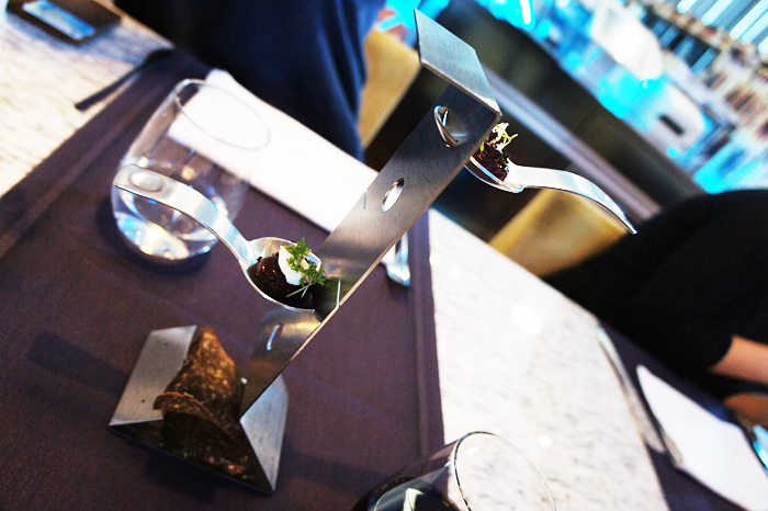 Där blev det lunch på restaurang Nero. Innan maten fick vi lite rödbetsmos med getostkräm.