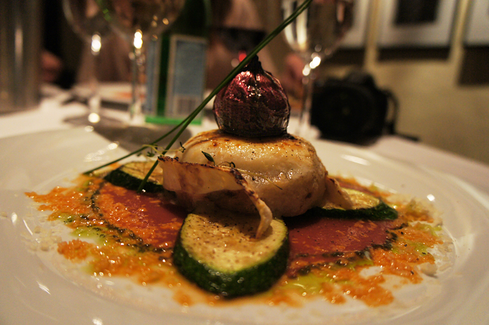 Och så åts det en massa god mat. Här ser vi den vegetariska förrätten: getost med grillad aubergine, squash och rödlök.