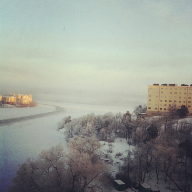Frostig morgon idag. Vackert men bitande kallt. Jag bor för övrigt i det där bostadsområdet som skymtar till vänster på bilden, om någon är intresserad.