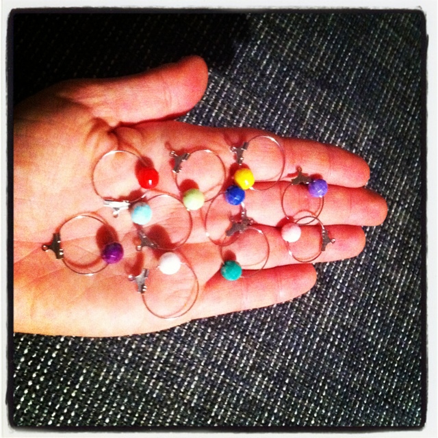 Så här har jag nu med hjälp av små ringar (som egentligen är örhängeshängen (skumt ord)) och pärlor i 10 olika nyanser knåpat ihop vinglassmycken som man fäster runt stjälken på glaset.