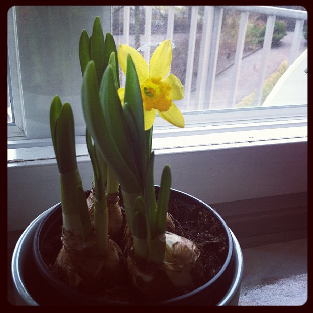 Stapplade mig upp till Vårdcentralen, läkaren klämde lite på min hals och sa att det nog bara var en förkylning, ”ta en Alvedon”, skickade hem mig igen. Och nu ligger jag här i soffan. Det var den förmiddagen det.Gick in på Coop på vägen tillbaka till lägenheten för att köpa fler apelsiner och kunde inte låta bli att plocka med mig en planta med påskliljor. Från och med idag är det vår!