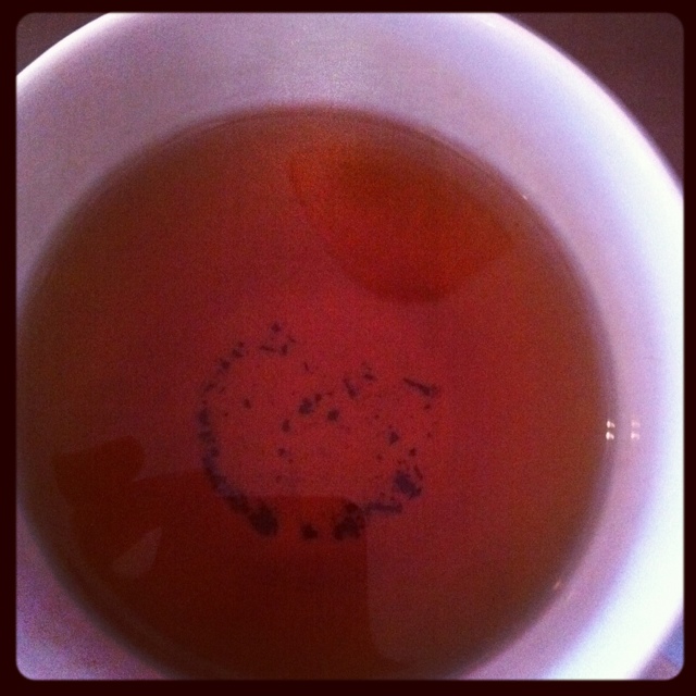 Sen försökte jag spå mig själv i bladen till mitt chaite. Jag såg ett hjärta och Martin en glad gubbe; i vilket fall som helst verkar det positivt. Notera min mobil och toppen av Martins huvud som speglas i tevattnet.