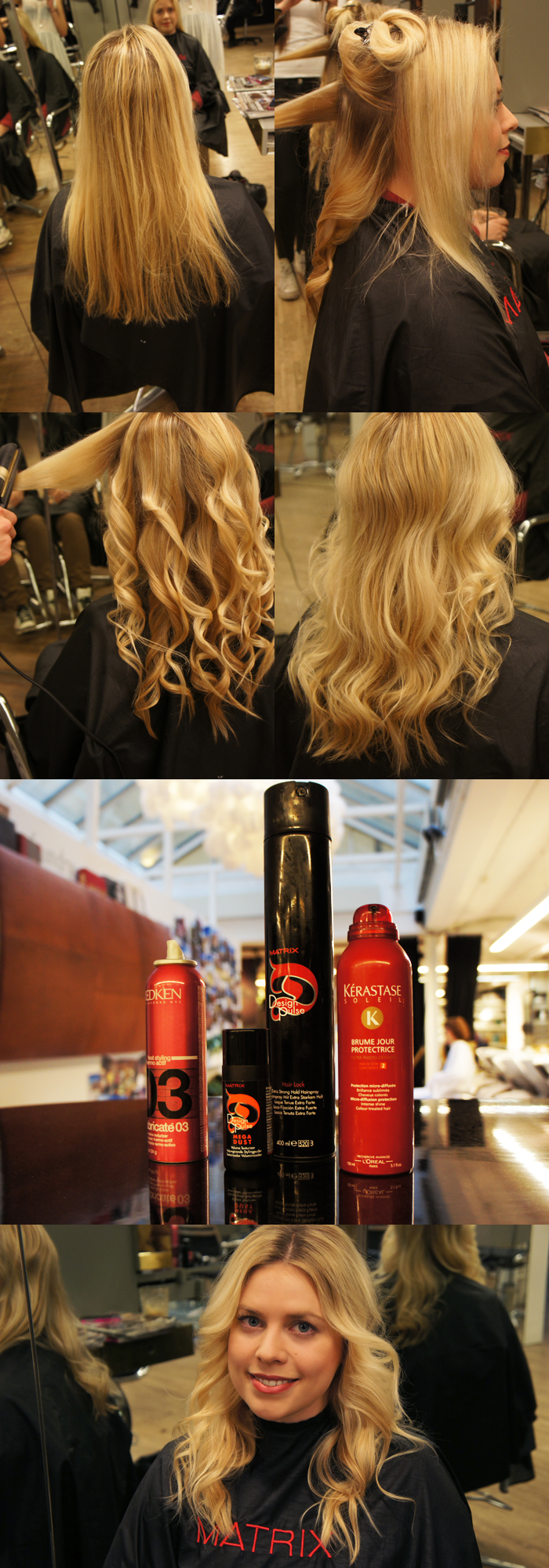 Jag fick ett bra tips av hårstylisten också. I stället för att tynga ner håret med massor av spray för att frisyren ska hålla, vilket bara gör den stel och orörlig, så pudrar man styling powder över längderna och kramar in det i lockarna. Man behöver fortfarande ha lite spray, men det krävs inte lika mycket.