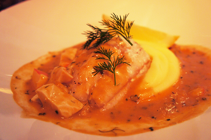 Flydde undan regnet in på Mvseet tillsamman med Pia, som varit i Amsterdam över påsken.Där får man alltid en liten, liten skål med soppa (idag blomkål, hur gott som helst) och en liten bit surdegsbröd innan lunchen.Sen kom vår pocherade kolja med kräftsås, dill och potatispuré. Helt okej, men jag tror inte att kräftsås riktigt är min grej.