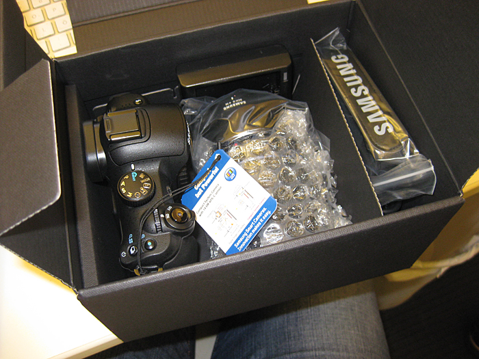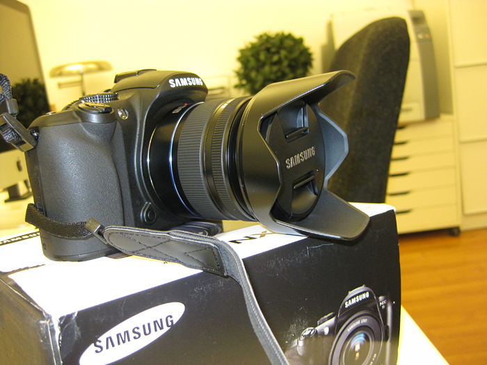 Men jag klarar mig inte utan en fungerade kamera och i går beklagade jag mig lite för chefen, då jag fick lov att plåta ett reportage med redaktionens urkassa minikompaktkamera. Så i dag kom han in med en kasse som han räckte över till mig. Däri låg en sprillans ny redaktionskamera, hurra! Jag håller på att ladda batteriet nu, sen ska jag börja fota loss.