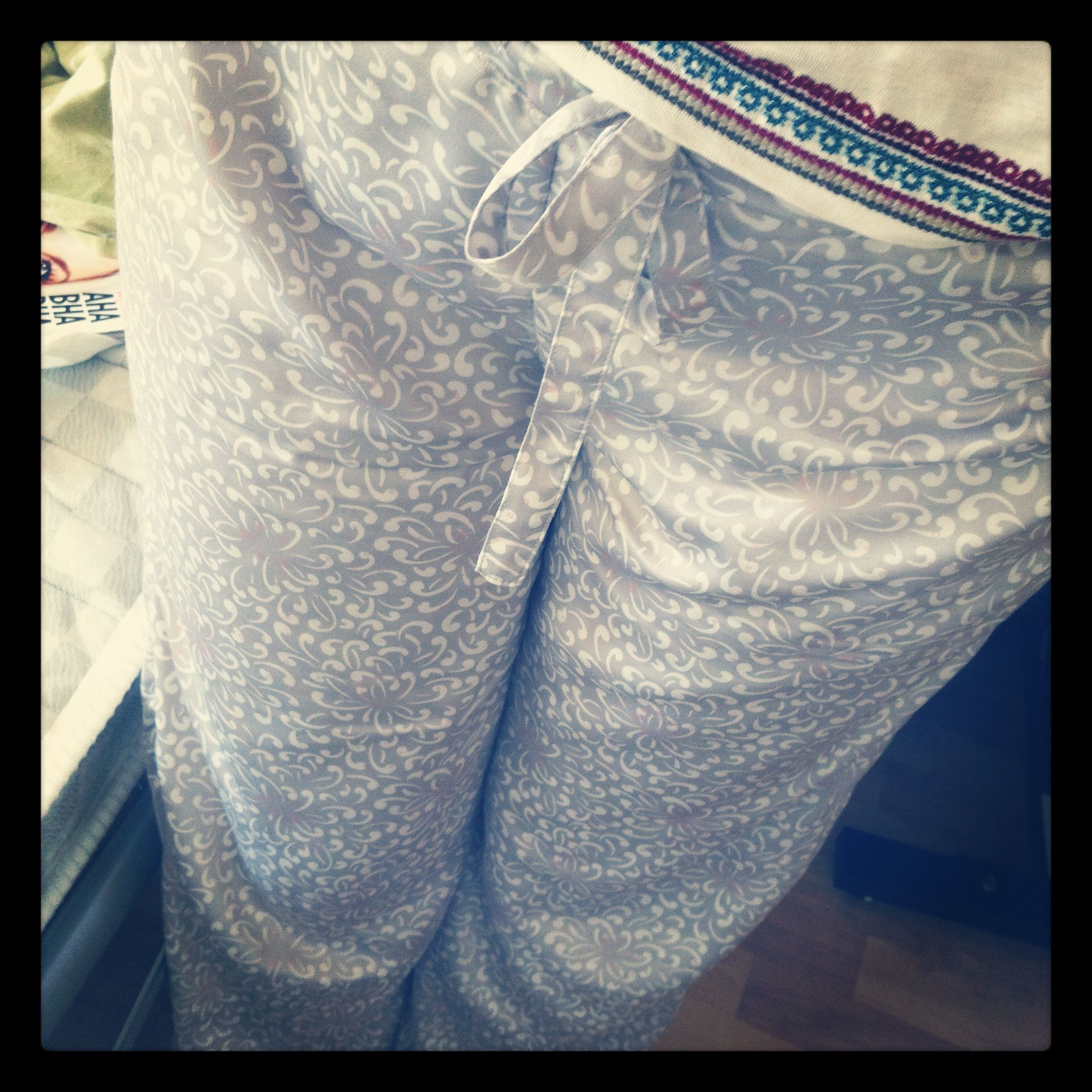 Jag noterar att det blivit trendigt med sidenbyxor och undrar nu: kan jag börja gå till jobbet i mina pyjamasbrallor snart? Säg ja! Det är i alla fall dagens jobboutfit; jag är ledig då vi är kvar i Skåne tills ikväll. Men ledig i mitt fall betyder frilansjobb från bäddsoffan medan Martin hjälper sin pappa att montera upp en dörr.