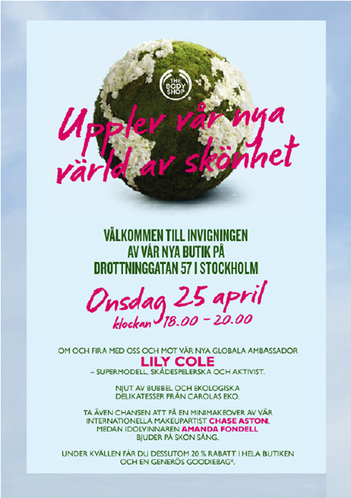 Nu ska jag iväg till Grand Hotel för att träffa den internationella makeupartisten Chase Aston, som sminkat kändisar som Cameron Diaz, Kate Moss, Terri Hatcher, Victoria Beckham, Alyssa Milano, Cindy Crawford, Elle Macpherson, Heidi Klum, Naomi Campbell, Claudia Schiffer och Tyra Banks (enligt The Body Shops PR-avdelning). Och ikväll blir det mer Body Shop, då jag och Alexandra ska hänga på eventet ovan!
