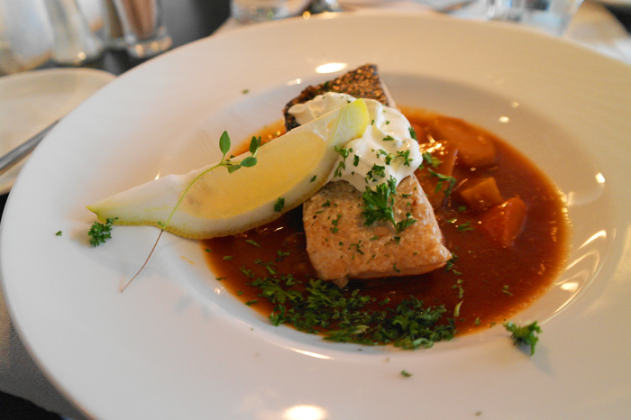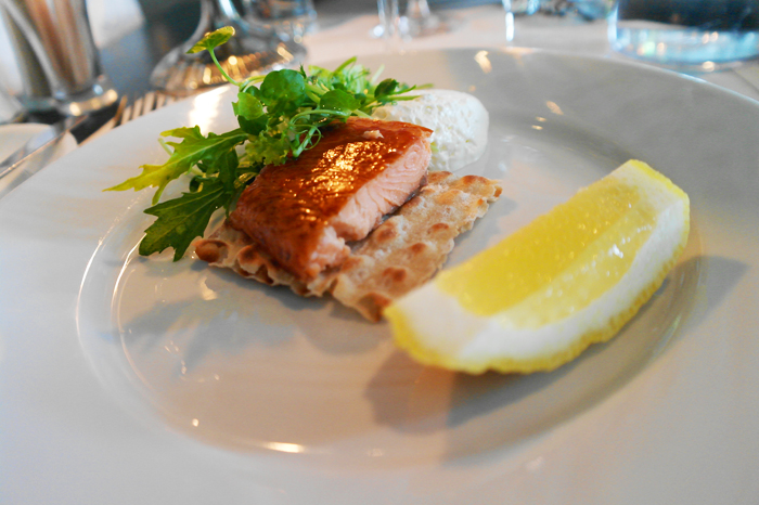 Man fick ett fisk- och ett köttval som förrätt respektive varmrätt. Eftersom varken jag eller Karro äter kött valde vi båda fisk, och började med varmrökt lax och pepparrotskräm. Mycket gott!