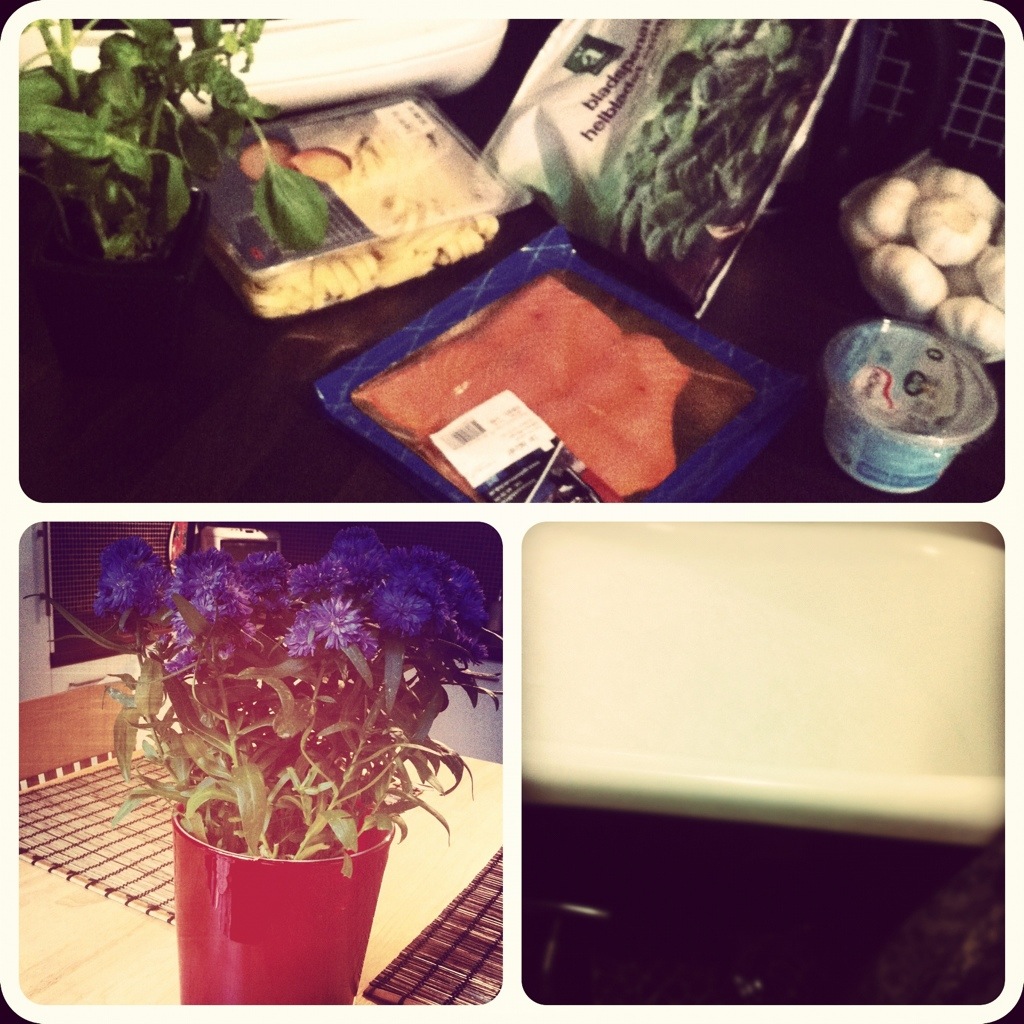 Semesterns sista kväll. Jag slängde ihop en laxpasta (middag på balkongen idag igen), fixade i lägenheten hela kvällen (inklusive att köpa hem nya lyans första blomma!) och avslutade det hela med ett varmt skumbad.