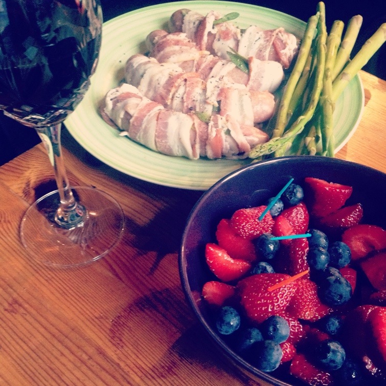 Kom hem till Helen efter lite hemmahäng. Elin fixade mat – baconinlindad Salsicca, nypotatis och sparris. Jag fixade sallad och frukt. Helen åt mest. Så är vår fördelning för det mesta, men alla är nöjda!