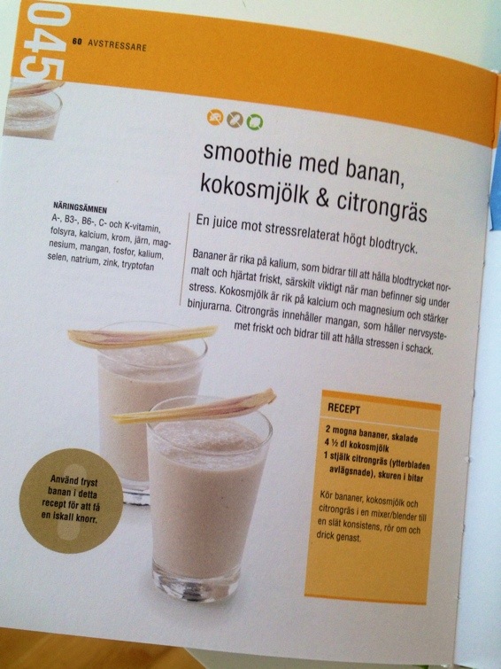 Avslappnings-smoothie 24 jun 2014 av Manuela Gaetani Pappa kollade upp alternativa metoder att sänka blodtrycket och hittade en smoothie som ska vara avstressande. Vi mixade banan, citrongräs och kokosmjölk – så gott! Väntar fortfarande på att huvudvärken ska släppa, får nog bli ett kokhett bad.