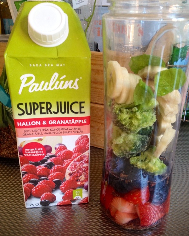 Dagens smoothie 4 jul 2014 av Manuela Gaetani Krossade linfrön, färska jordgubbar, blåbär, banan, broccoli, Kakao nibs och myntablad. Grymt god!