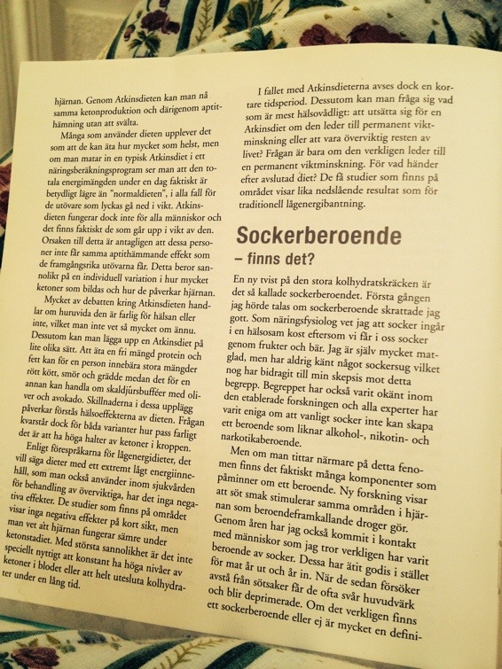Läser de sista sidorna i boken Näringslära. Galet trött i dag eftersom en fluga trakasserat mig hela natten, och gör det fortfarande. Sover de aldrig? I alla fall – jag läser nu om sockerberoende och är sjukt glad över att jag inte är, och aldrig varit, en ”sockertjej”.