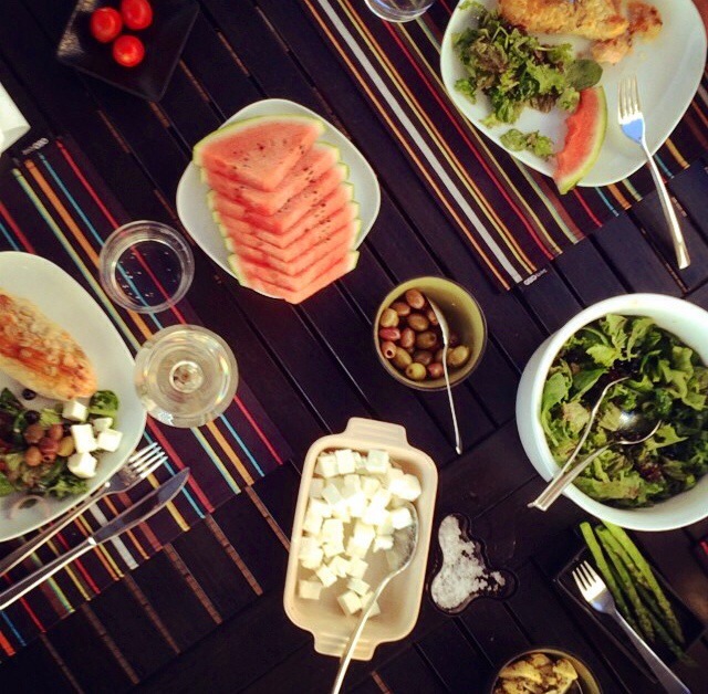 Firande 6 aug 2014 av Manuela Gaetani I går blev det en hel del vin, kackel och fantastiskt god mat på pappornas terass. Elin fyllde ju år, så det var hennes födelsedagsmiddag. Mysig stämning och skön utomlandskänsla. Elin dokumenterade maten med sitt ovanifrån-perspektiv – snyggt!