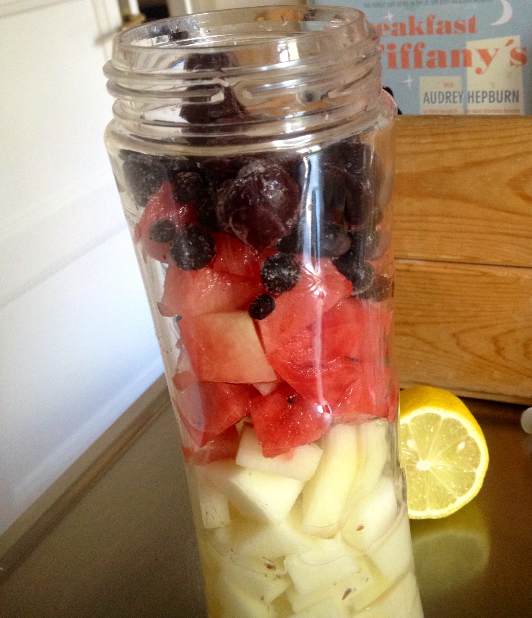 Dagens smoothie 20 aug 2014 av Manuela Gaetani Började dan med en smoothie. Denna innehåller krossade linfrön, pressad citron, päron, äpple, vattenmelon, körsbär och blåbär. Gött!