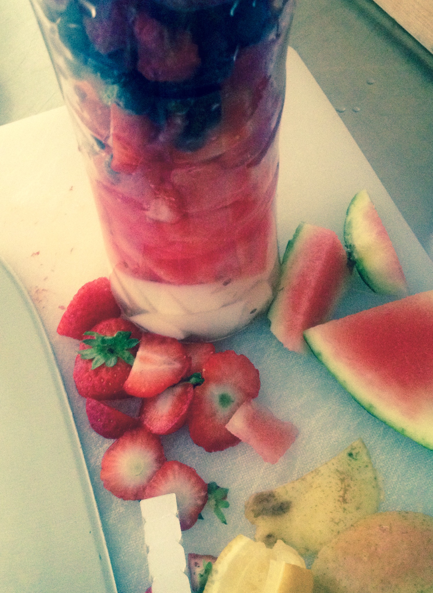 Dagens smoothie 28 aug 2014 av Manuela Gaetani Pressad citron, krossade linfrön, päron, vattenmelon, jordgubbar, fryst spenat, frysta hallon och blåbär och Brämhults apelsinjuice. Gött!