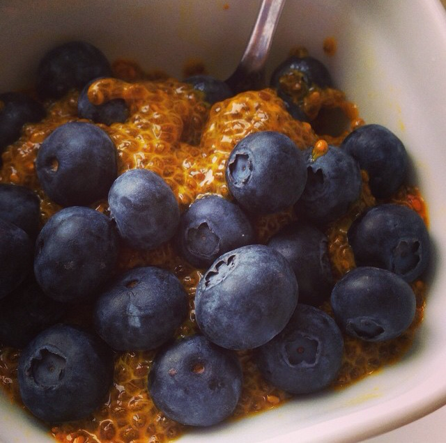 Nedan: Min pappa kom till mig på jobb med en chiapudding gjord på mandelmjölk med saffran och blåbär. Galet gott!