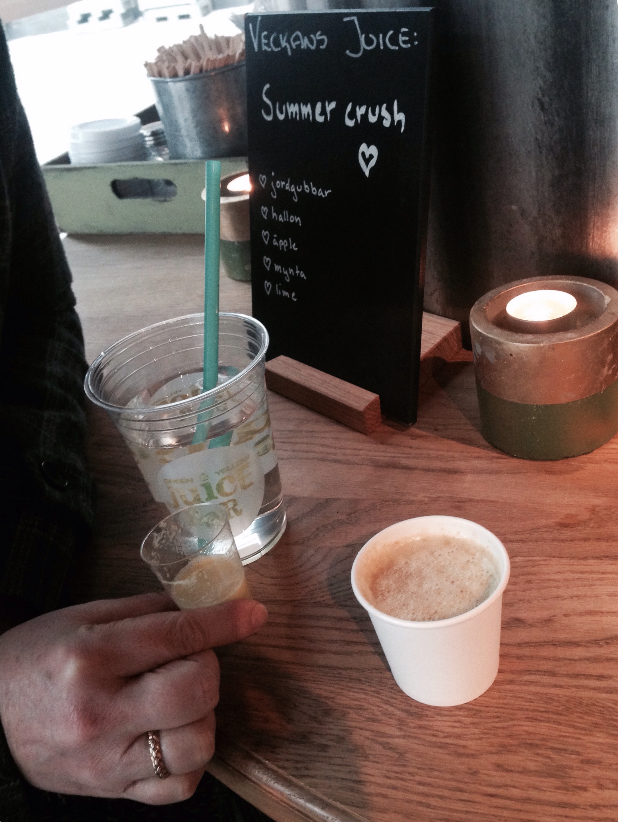 Mötte upp Helen efter jobb och tog en promenad till Juicebaren, där vi beställde varsin shot. Jag drack en ”Strong apple” (äpple, citron och ingefära) och Helen en ”Ginger flu” (ingefära och citron).