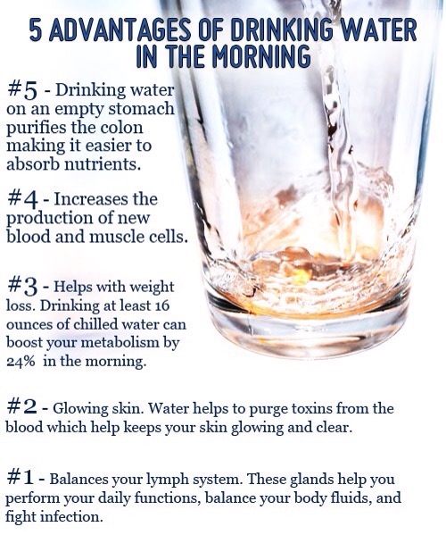 Jag börjar varje morgon med ett par glas vatten, eftersom kroppen blir lätt uttorkad under natten. Många människor dricker väldigt lite vatten, vilket gör att blodet blir tjockare och mer trögflytande, vilket i sin tur gör att näringsämnena inte tar sig runt i kroppen lika snabbt och effektivt.