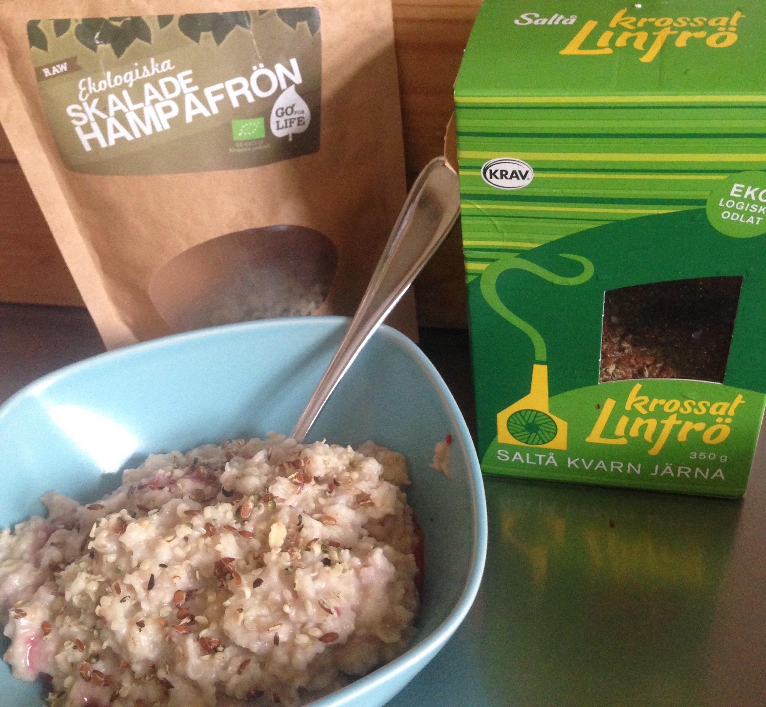 Sen strör jag över hampafrön och/eller krossade linfrön. Bra källor till Omega3. Och så till det protein i form av ett ägg, och ett knäckebröd med mosad avocado.
