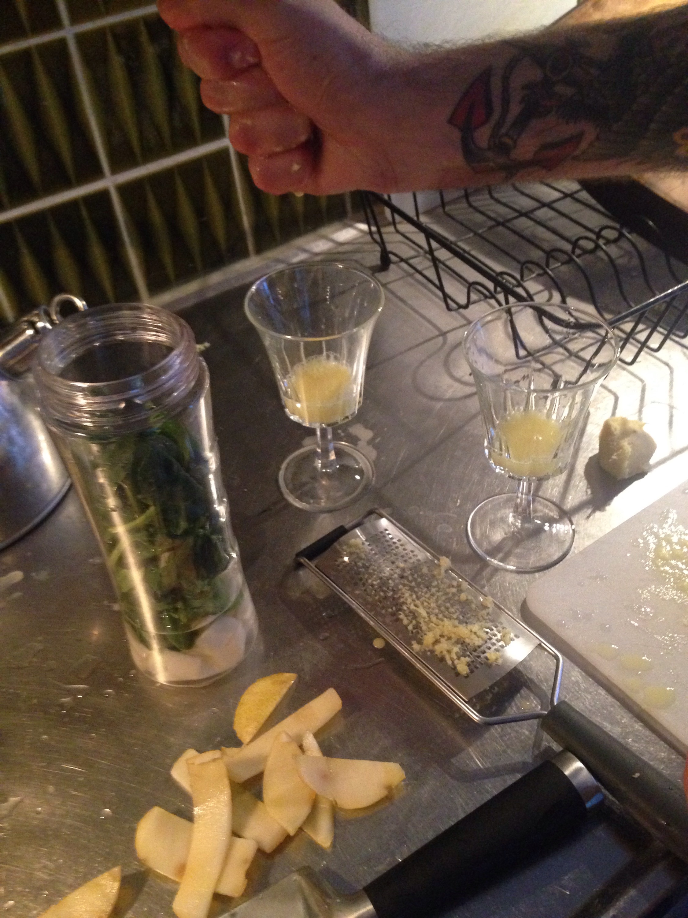 I dag har jag mest promenerat i sol och just nu befinner jag mig hemma hos pojkvännen. Vi fixade varsin shot gjord på lime, citron och ingefära och sen mixade jag varsin smoothie med päron, lime, hallon, spenat och apelsin- och jordgubbsjuice.