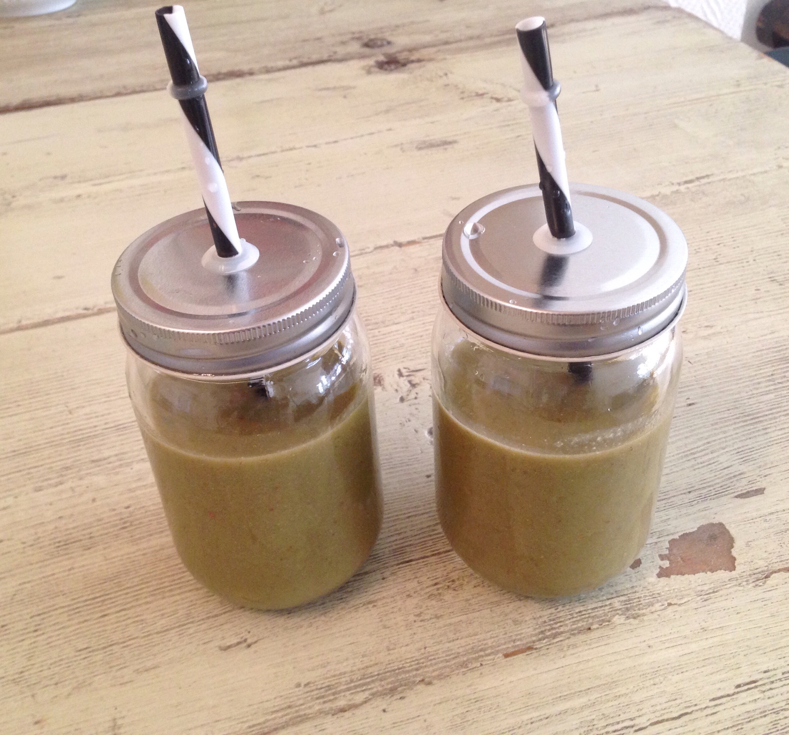 Om en stund ska jag iväg och träffa en vän och istället för dyr fika så fixade jag varsin smoothie som vi kan dricka när vi är ute och går. Perfekt! (Den något oaptitliga färgen kommer från spenat och avocado.)