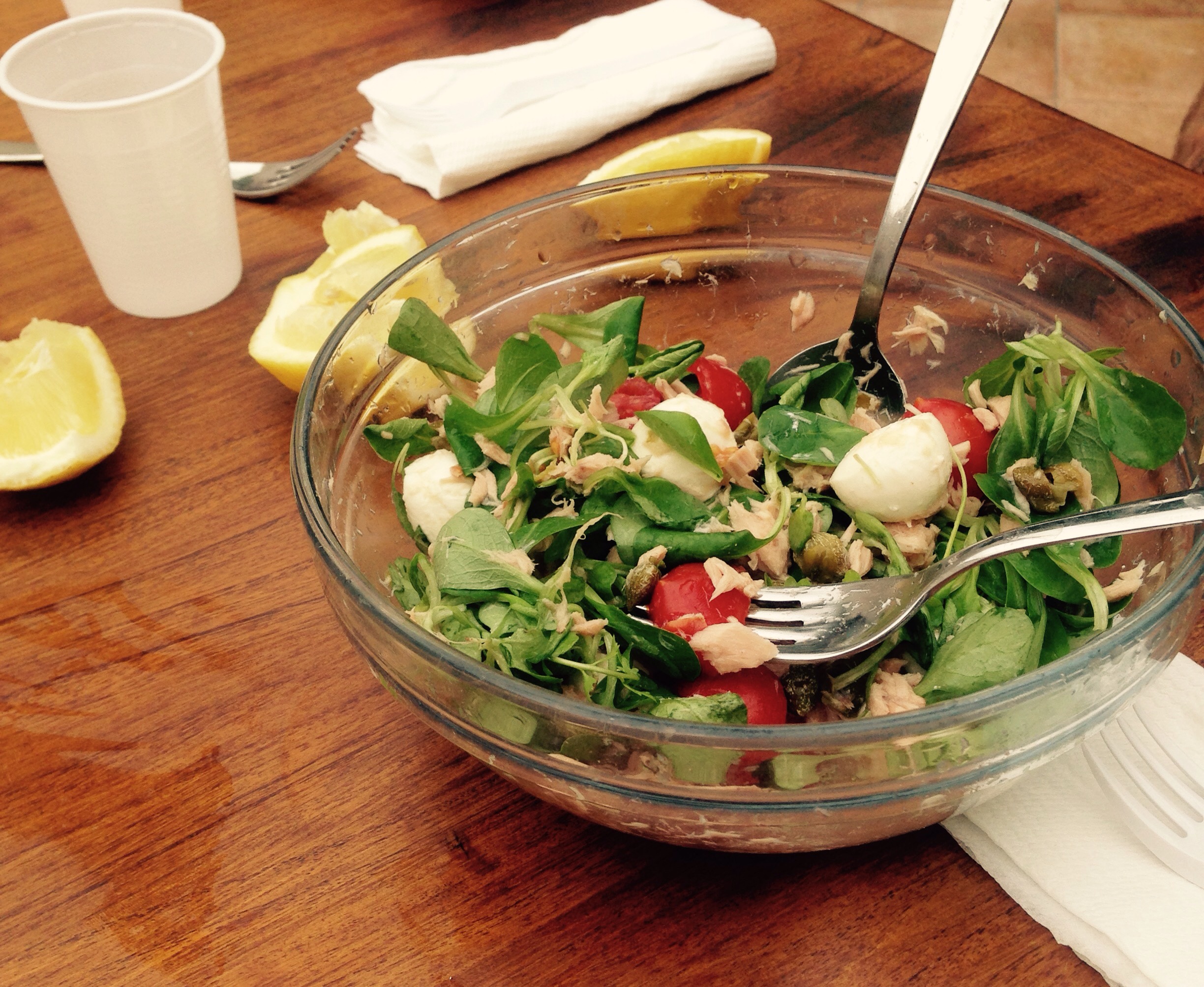 Så i dag gick vi till affären och köpte ingredienser till en tonfisksallad och till det drack vi citronvatten, av citroner plockade direkt från trädet på vår terrass. Så gott!