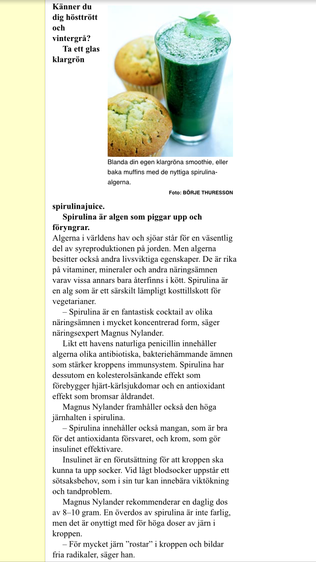 Köpte Spirulina i dag, ett slags alg som ska vara otroligt nyttig. Det innehåller höga halter av järn och antioxidanter. Jag blandade i en halv tesked i smoothien, som fick en grön, läskig färg men smakade helt ok.