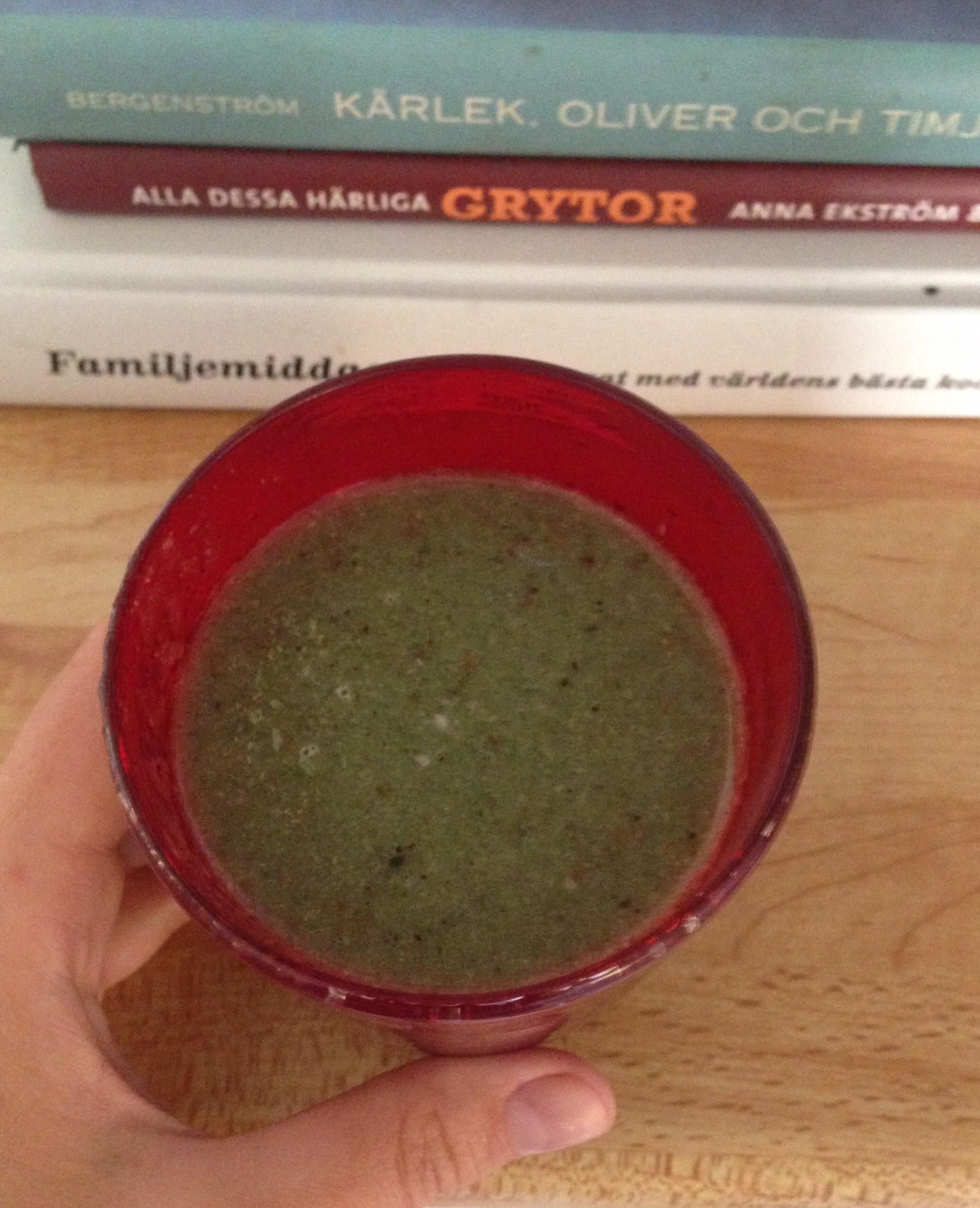 Mixade ingefära, pressad citron, linfrön, banan, kiwi, broccoli, Spirulina och Brämhults jordgubbsjuice. Droppade även i D-vitamin eftersom det fortfarande känns som höst här hemma. Hoppas att jag ska känna mig lite piggare efter denna smoothie.