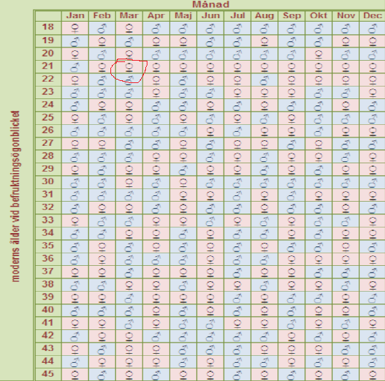 Det går till så att man letar upp hur gammal man var när befruktningen skedde och vilken månad. Som ni ser här fick jag resultatet flicka.