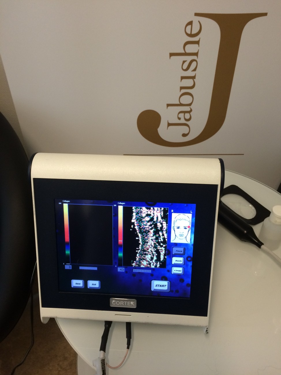 Denna lilla apparat kan se en hel del på gott och ont. Den har också uttag för att mäta en hel del andra roliga saker i huden, hur mycket fukt som finns i huden, även ett instrument som mäter hur mycket fukt vi läcker, självklart pigmentförändringar, en kamera som man kan titta på upp till x50 förstoring på hudförändringar och elasticiteten i huden. Jag har just nu kollageninstrumentet med mig då vår produkt, Jabushe stimulerar just kollagenet. Så man får se en hel del olika ”ansikten” en dag på jobbet.