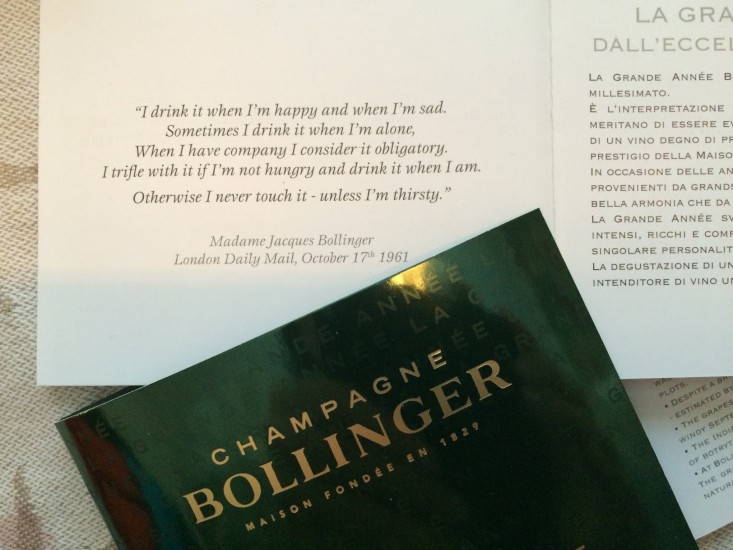 Skulle passa bra med en paljettlångklänning till denna dryck (det får bli nästa nyår). Enligt Madame Jacques Bollinger själv så finns det egentligen inget tillfälle att inte dricka champagne, är benägen att hålla med.