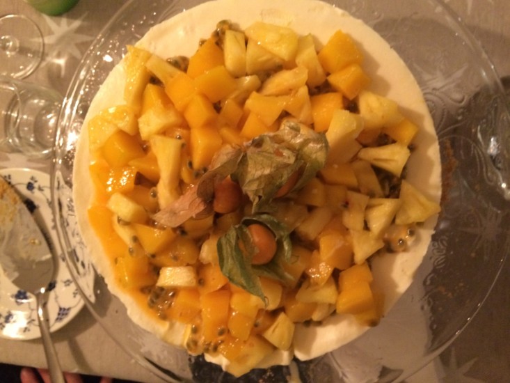 Det är mycket lättare att sätta sig vid ett middagsbord och äta och dricka gott. Det blev lite Tex Mex till förrätt, en gudagod fisksoppa som min man hade gjort på lax, torkrygg, räkor, musslor, saffran, vin m.m. Till dessert hade jag gjort en cheesecake som toppades med färska frukter, baby-ananas, mango, passionsfrukt och physalis.