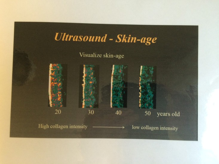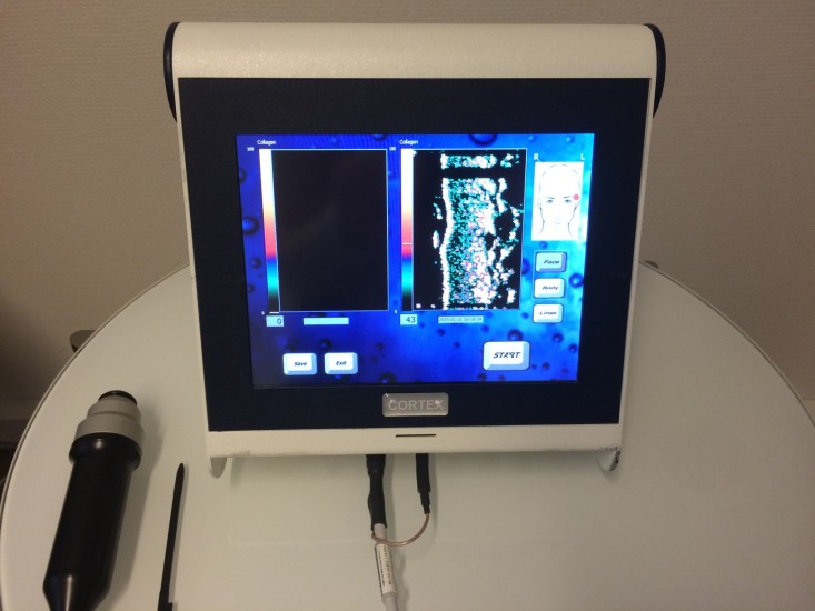 Man ser överhuden och hur tjock/tunn den är om den är mer eller mindre torr. Nästa lager är läderhuden och där tittar man på aktiviteten i huden, aktiviteten avtar med åldern. Sist men inte minst tittar man på kollagentätheten i huden. Jag brukar säga -att kollagenet är som stoppningen i kudden-, när den avtar ”faller” huden ihop. Kollagenet avtar med 1-2 % per år från ca 25 års ålder och det är då vi börjar få lite fina som så småningom övergår till djupare rynkor, förstorade porer och vi tappar vid konturerna i ansiktet (käkpartiet, halsen, ögonen).