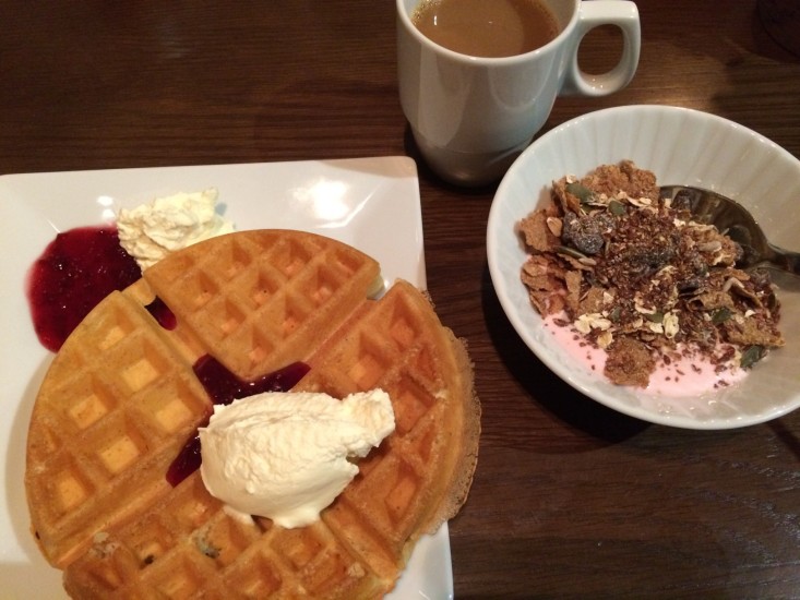 På söndagar är det skönt att få sova ut, att slippa kasta sig iväg och trängas i kollektivtrafiken. Det andra är att man kan alltid äta lite extra till frukost. Våfflor med grädde och sylt går inte av för hackor och konstigt nog är det lika gott varje gång.