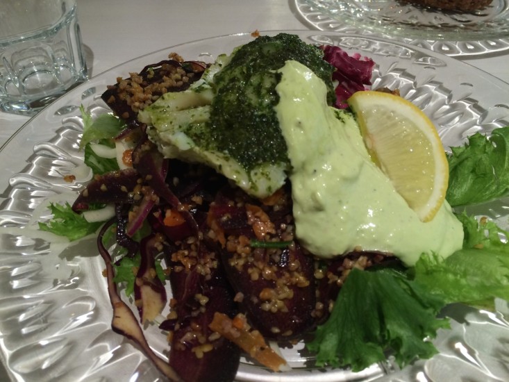 Deras matfilosofi innebär innovativ, snygg enkel och god mat. Dessutom så väljer de råvaror efter säsong och då gärna eko och närodlat. Från det egna bageriet kommer bakverk och rawfoodbakverk, kan de bli bättre? Att använda ekologiska produkter ligger dem varm om hjärtat då de gör gott både för kroppen och miljön. Som ni redan vet så påverkas även huden av vad vi äter, så det vi stoppar i oss på insidan syns så småningom på utsidan. Min dotter som arbetar som PT är dessutom mycket kräsen med sin mat. Hon valde en citron och örtöverbakad torsk som tydligen var gudomlig. Hon hade önskat mer torsk än det som fanns på tallriken.