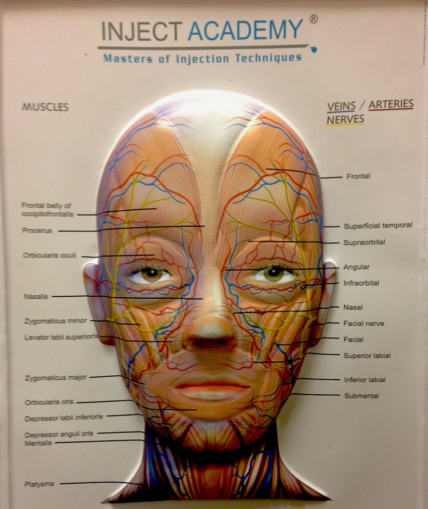 Jag är alltid med och iakttar allt och alla under våra kurser på InjectAcademy. Vi lär ut injektionstekniker i hudfillers och botox till läkare, tandläkare och sjuksköterskor. Ibland kommer jag  på något nytt som jag kan förbättra eller tillägga till kurserna.  Ett exempel är vår 3D affisch som visar ansiktet och halsens alla vener, artärer muskler och nerver. Den får alla kursdeltagare med sig efter kursen för att alltid komma ihåg de känsliga ställena när man behandlar. Jag gav en duktig illustratör uppdraget att rita ansiktet och hade sedan flera läkare och kirurger i både Sverige och Frankrike som gick igenom den tills allt stämde. Senare sålde jag även 100 000 3D affischer till ett franskt företag som idag distribuerar den i 70 länder. På Beauty Through Science mässan i år gav jag bort ett hundratal i en goodiebag till plastikkirurger från hela världen.