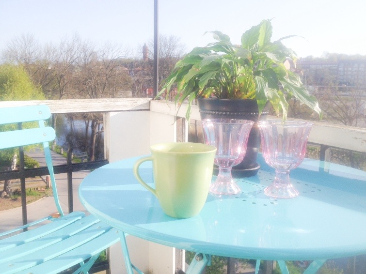 Jag satte ut möblerna på balkongen igårkväll så nu kan jag dricka mitt morgonkaffe där, sån lyx. Det enda som saknas är två klängväxter i hörnorna. Det är en väldigt liten balkong men den räcker, vi har ju hela takterrassen också.