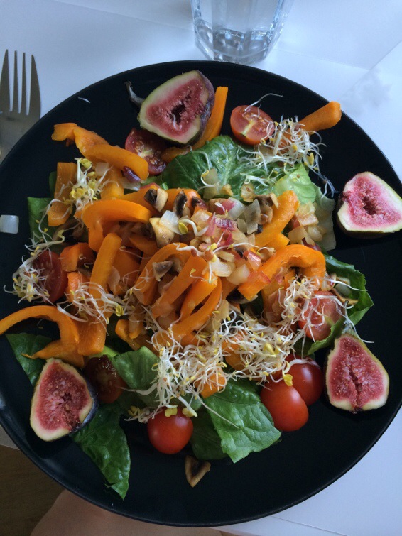 Jag gjorde mig en himla nyttig middag. Jag kände nu efter midsommar, kalas och en weekend i Stockholm så hade min mage fått nog av onyttigheter så blir det nyttigheter istället. Massa sallad och frukt ska jag äta denna veckan. Vi köpte all sallad och frukt ekologiskt (utom avokado för det är skitdyrt) så nu kan jag rensa kroppen på riktigt. Känns skönt. Till middag idag blev det (för min del, Emil åt kycklinggryta som luktade fantastiskt) stekt lök, vitlök, svamp och paprika, med sallad, tomater och fikon, och citronsaft och olivolja på. Olivolja för mer smak och så blir man mättare. Faktiskt helt okej, jag är ju inte så förtjust i sallad men det funkade. Det ser ju fint ut iaf, haha.