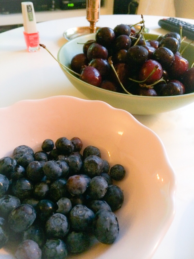 Vi åt en god middag och nu sitter vi bänkade framför nästa match, jag ska snart sova om jag ska orka upp i vettig tid imorgon, så jag hinner väl inte så klart på matchen. Jag köpte fina blåbär och körsbär. Körsbären är närodlade från Sölvesborg och blåbären är inte lika närodlade precis… Längtar lite till om några veckor nr blåbären dyker upp.